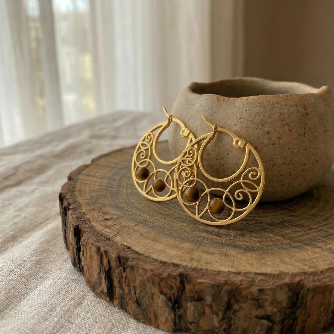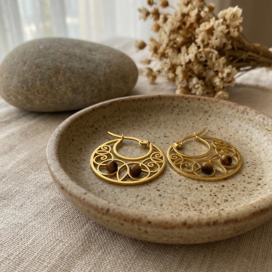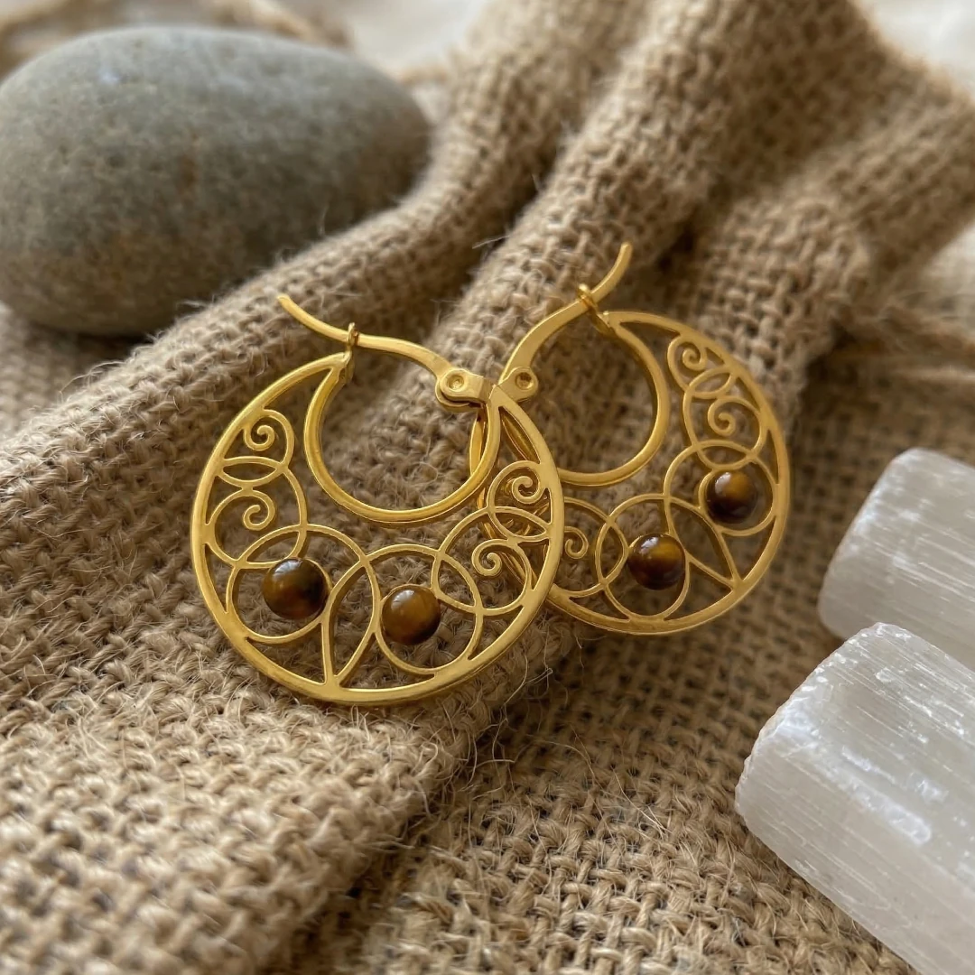 El Poder del Ojo de Tigre: En la base de cada aro descansan tres esferas de esta poderosa piedra semipreciosa. El ojo de tigre es el gran aliado de la confianza y el poder personal (asociado al Chakra del Plexo Solar). Llevarlo cerca del rostro te ayuda a proyectar seguridad, fomenta la valentía para tomar decisiones y actúa como un escudo tradicional contra las envidias y las energías densas.